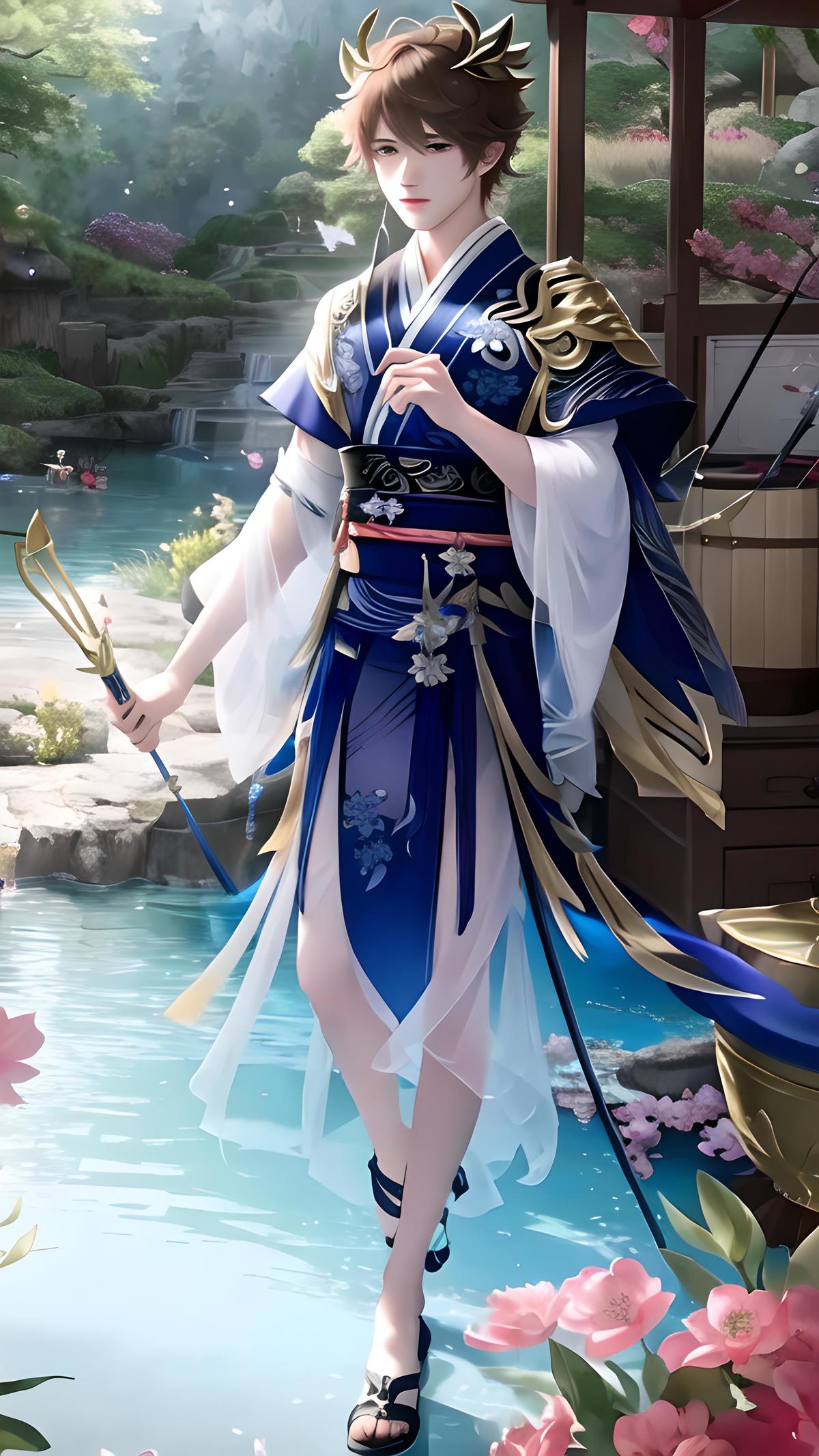 男穿蓝色衣服,手拿神级鱼竿,穿现代拖鞋