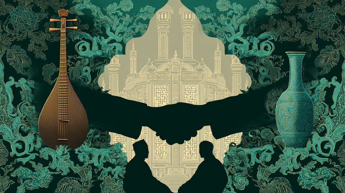 以浙阿文化的交流为主题,以“丝绸之路”为灵感,展现了跨越时空的文明对话。画面中心...