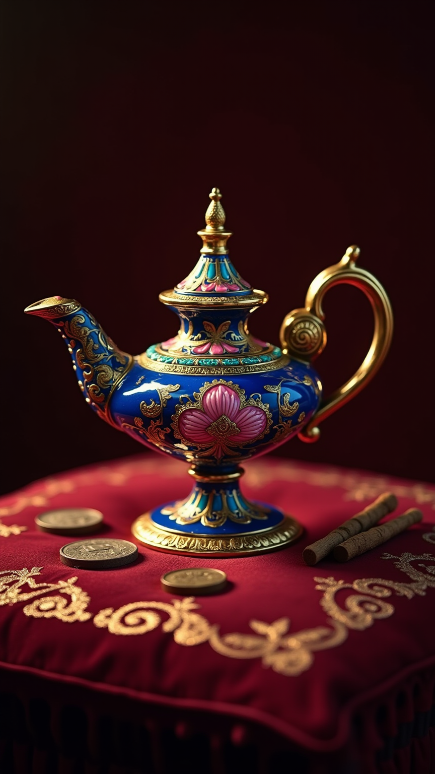 A deep blue enamel Aladdin's magic lamp, decorated with intricate gold filigree patterns and pink floral motifs, inlaid with turquoise and rubies. Ornate gold spout, handle, and base. placed on a deep red silk cushion with gold embroidery, surrounded by a few old coins and spices, warm lighting, dramatic shadow, hyper-realistic photography, close-up shot, sharp focus, studio lighting, 8k