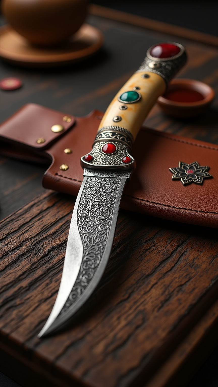 A masterpiece close-up shot of a Yingisar knife from Xinjiang, lying on a textured wooden table. The knife features a slender, gracefully curved steel blade with intricate Islamic patterns etched near the hilt. The handle is made of high-quality ox horn or precious wood, inlaid with vibrant red, green, and blue gemstones and silver wire. Beside the knife is its finely crafted leather sheath, decorated with matching patterns. The lighting is soft and dramatic, highlighting the metallic luster of the blade and the rich texture of the handle. Style of Uyghur traditional craftsmanship, hyper-detailed, photorealistic.