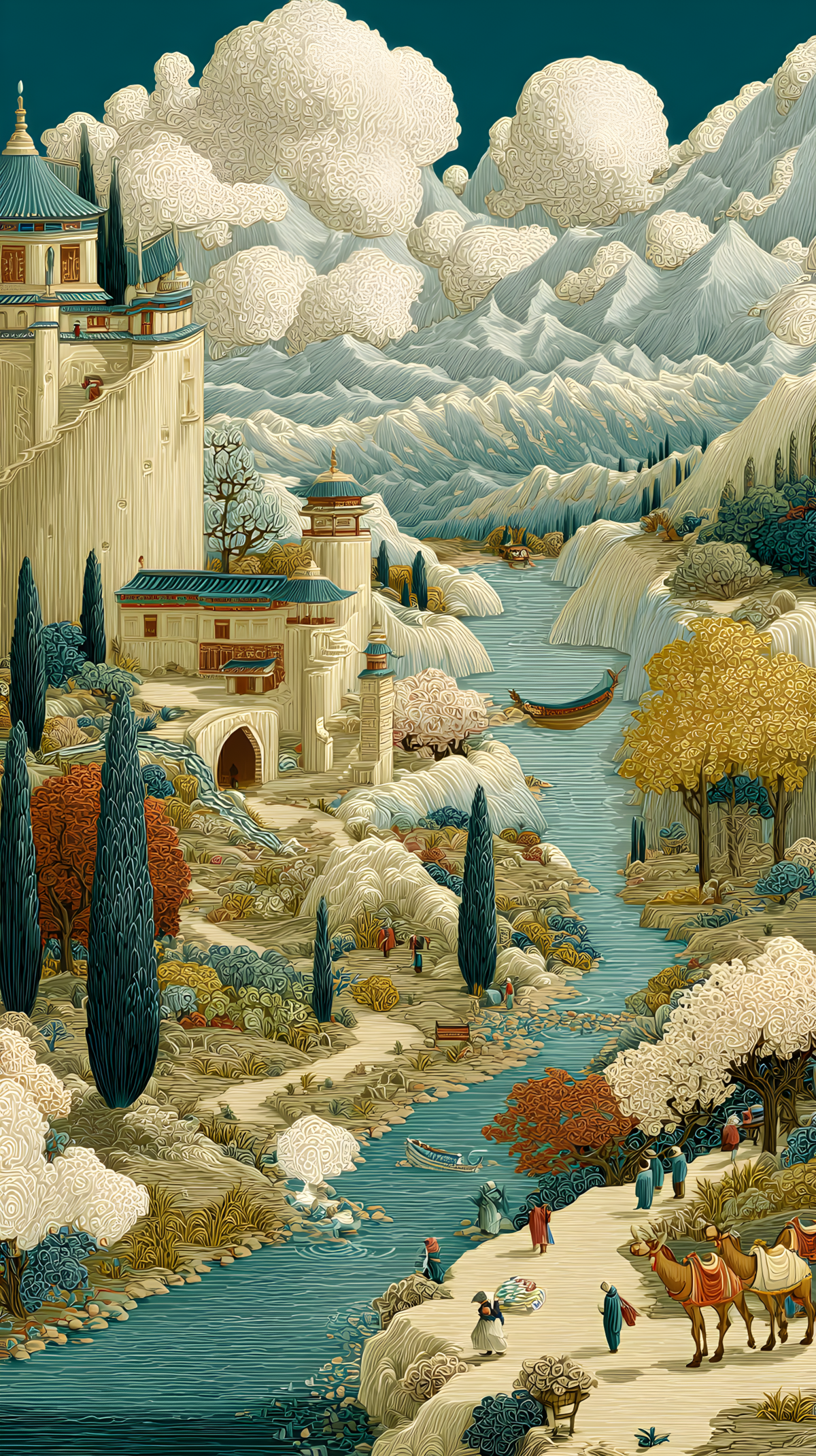 The Silk Road begins in Zhejiang’s misty rivers and flows into Aksu’s golden desert. A silk ribbon forms a river connecting tea gardens, celadon pottery, embroidery, and poplar forests. Camels walk along the glowing path — a poetic vision of cultural fusion.