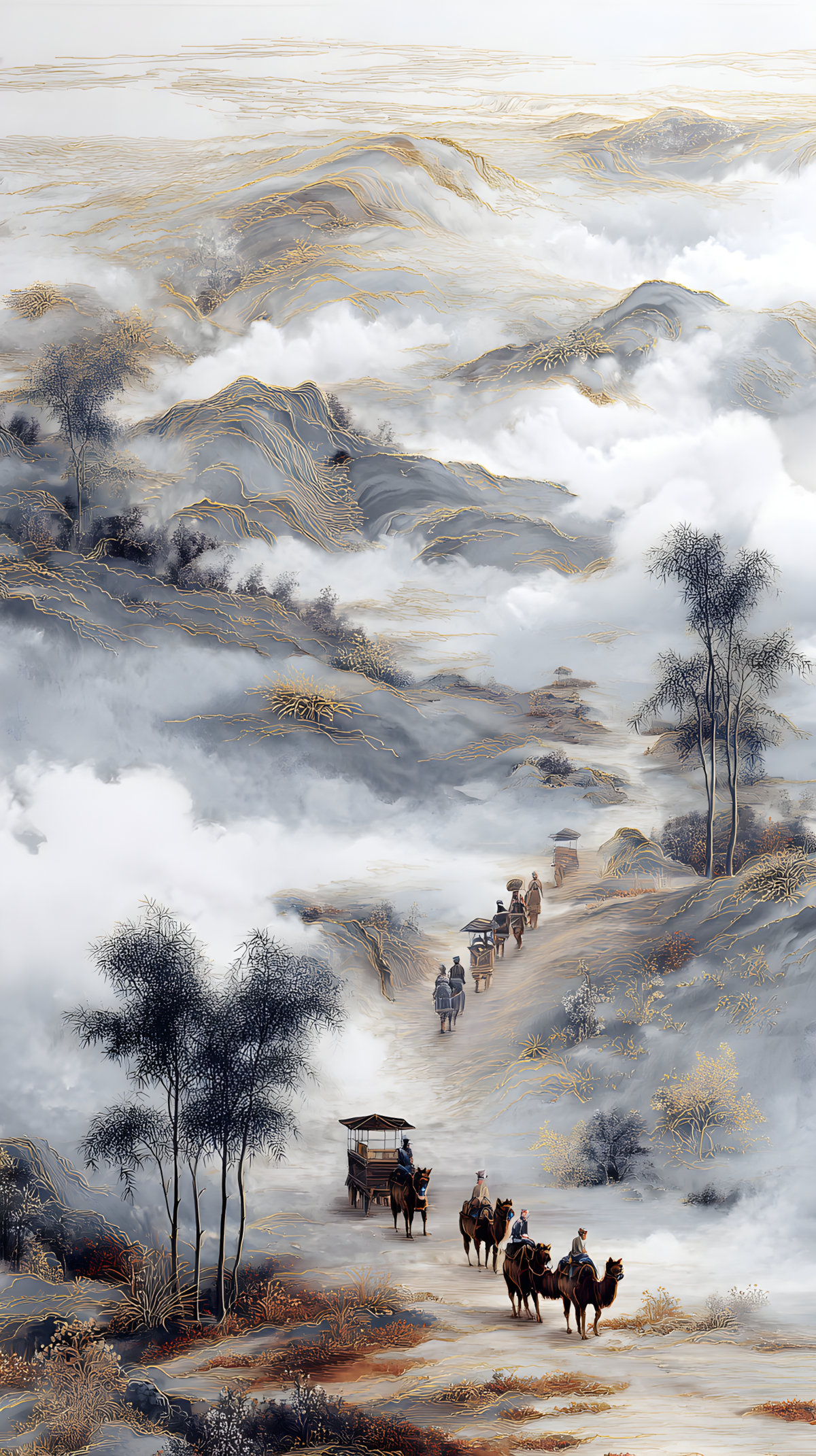 Half misty Jiangnan, half golden desert of Aksu. Celadon-toned clouds merge with embroidery patterns; a caravan walks across the fusion of two worlds — harmony between east and west.