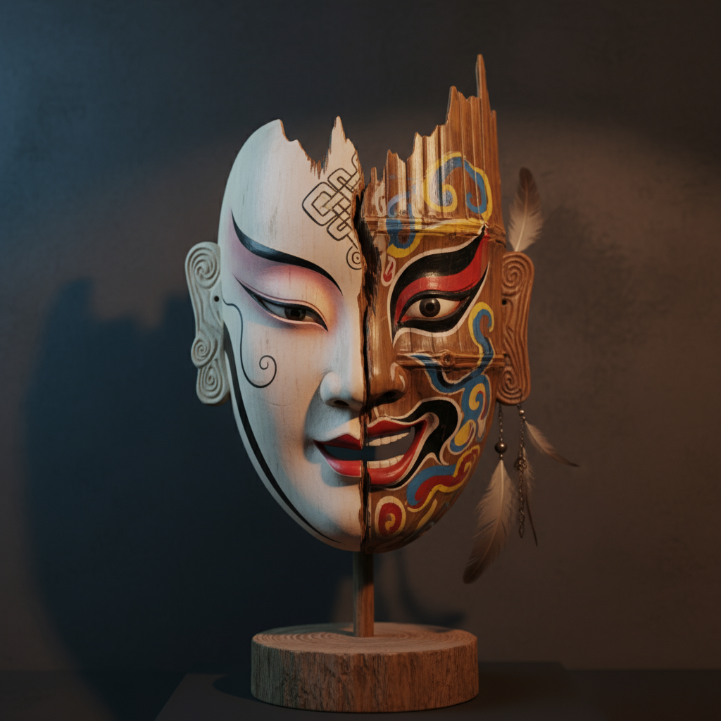 一个雕刻着两种文化图腾的木面具,一半是越剧人物的宁静面孔,一半是达瓦孜表演者的鲜...