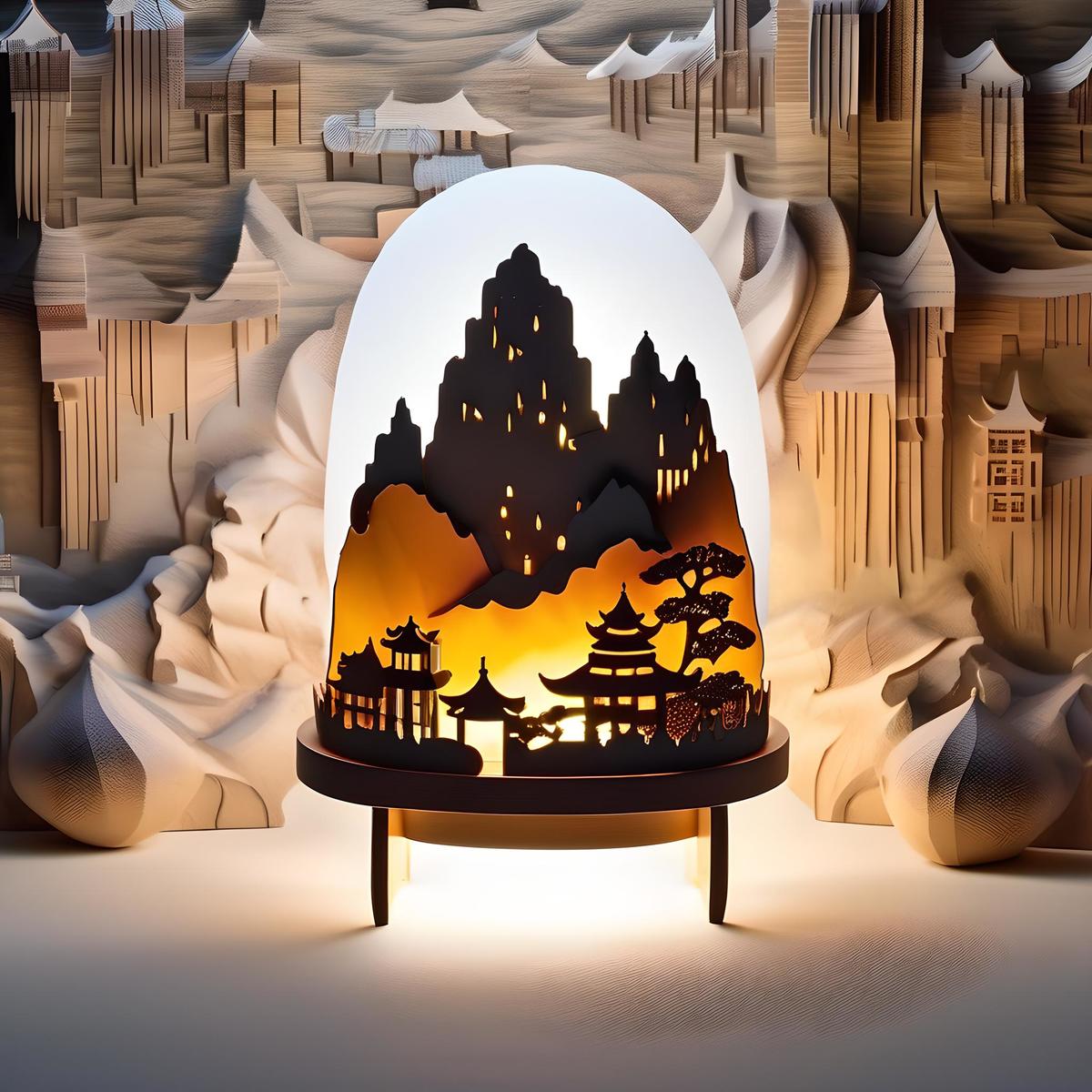 一款精美的纸雕夜灯,运用3D立体分层艺术手法。前景是浙江的富春江山水,中景呈现阿...