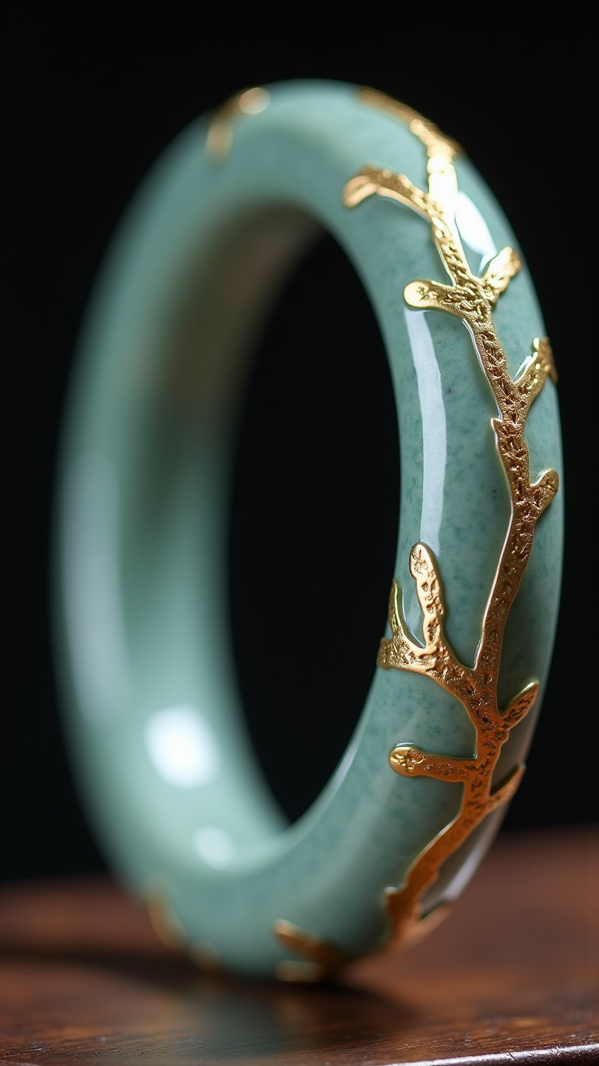 浙江龙泉青瓷材质手环,主体浮雕丝绸缠枝纹与阿克苏"生命之树"几何纹交错图案,表面...