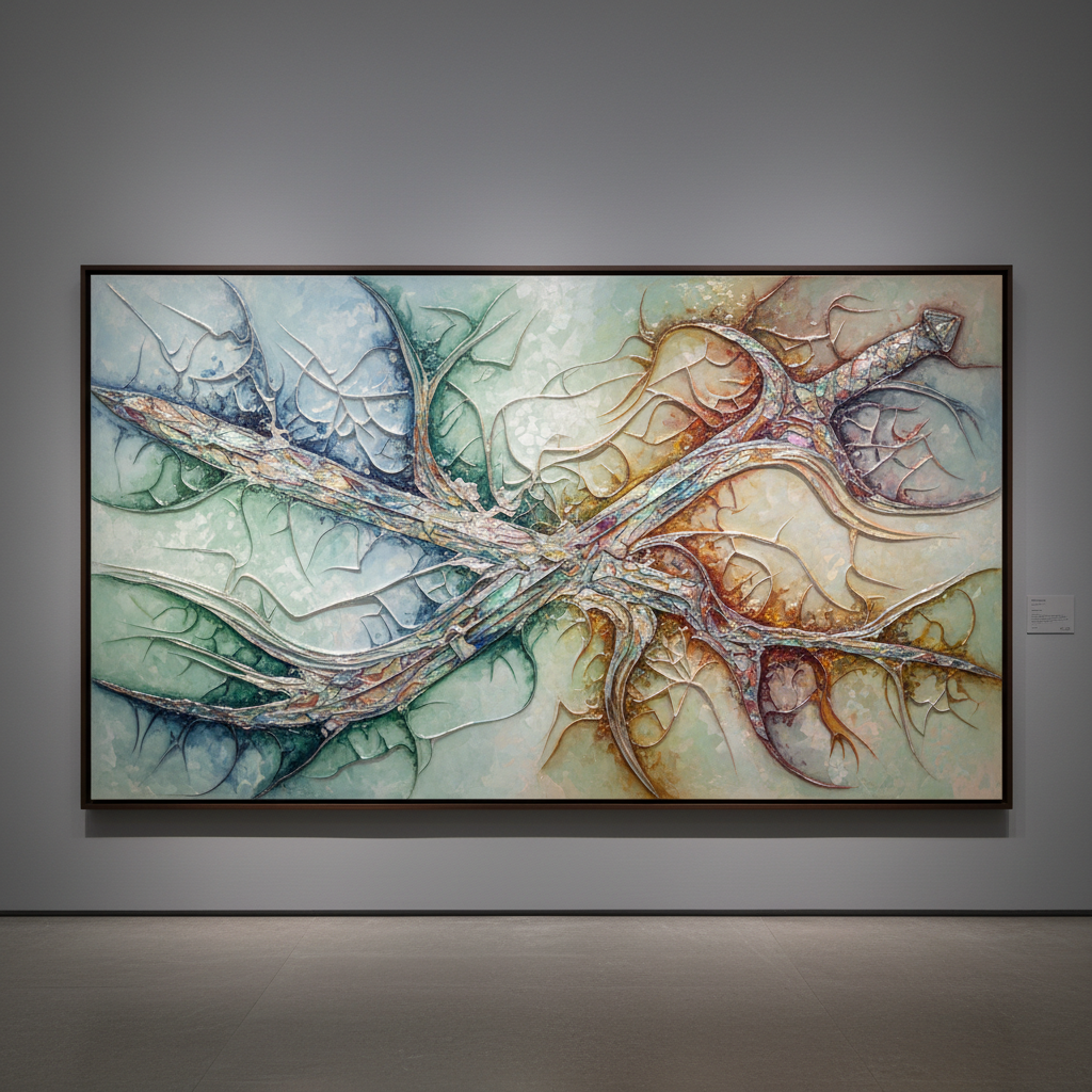 装饰艺术画,使用浙江青瓷粉、阿克苏矿产、珍珠贝母等天然材料为颜料,以宝剑锻造的力度在画布上创作出抽象的青瓷冰裂纹与木卡姆旋律图。画作在光线变化下呈现不同色彩,兼具东方韵律与西方抽象表现主义风格,美术馆级质感