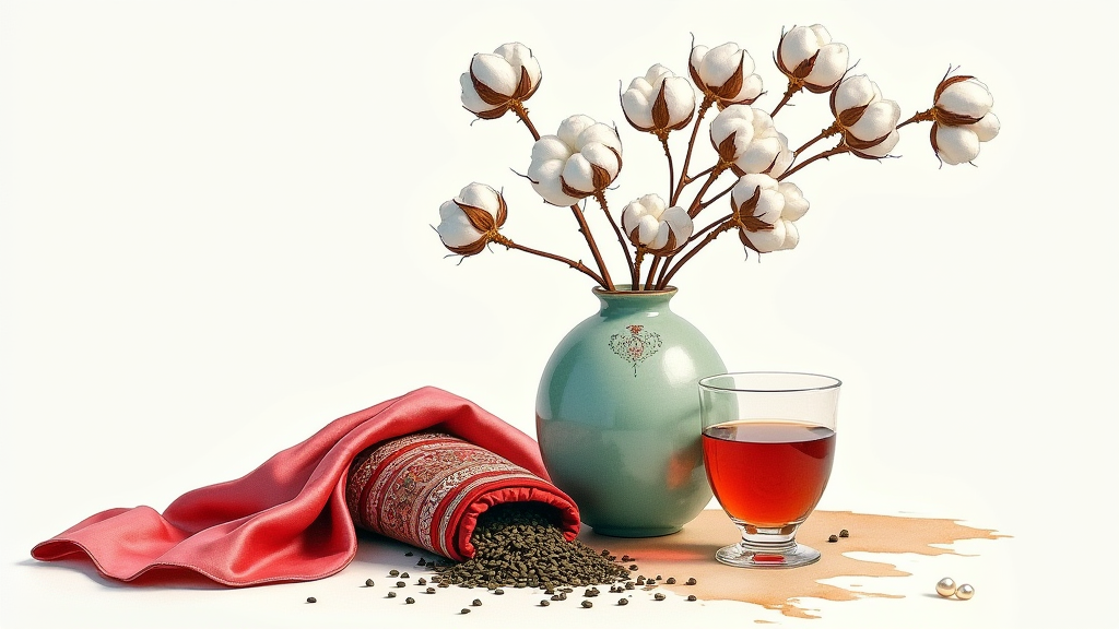 Elegant watercolor study, wet-on-wet technique showing Zhejiang celadon vase (with subtle crackle pattern) holding fresh cotton branches from Aksu, Kyrgyz embroidered pouch draped beside spilled tea leaves, Musalev wine in translucent glass catching light, silk scarf flowing like watercolor wash across composition, single pearl as luminous focal point, bleeding pigments where wine red meets tea green, traditional Chinese painting brushstrokes, Hahnemühle paper texture, natural daylight, artistic master
