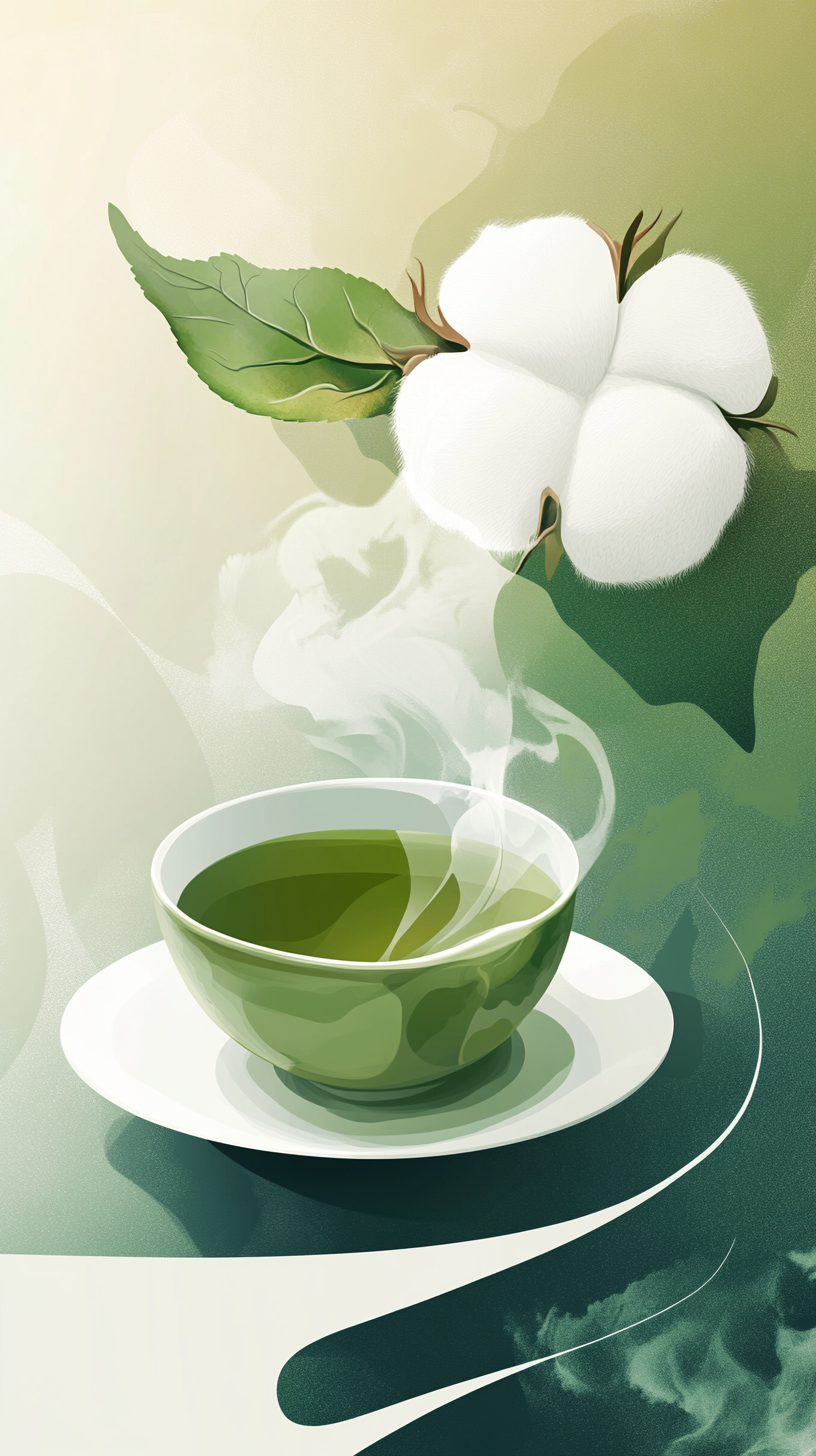 江南茶烟萦绕西部棉枝,青绿与纯白的色调串联跨区域元素,茶的雅润与棉的轻柔相融,既...