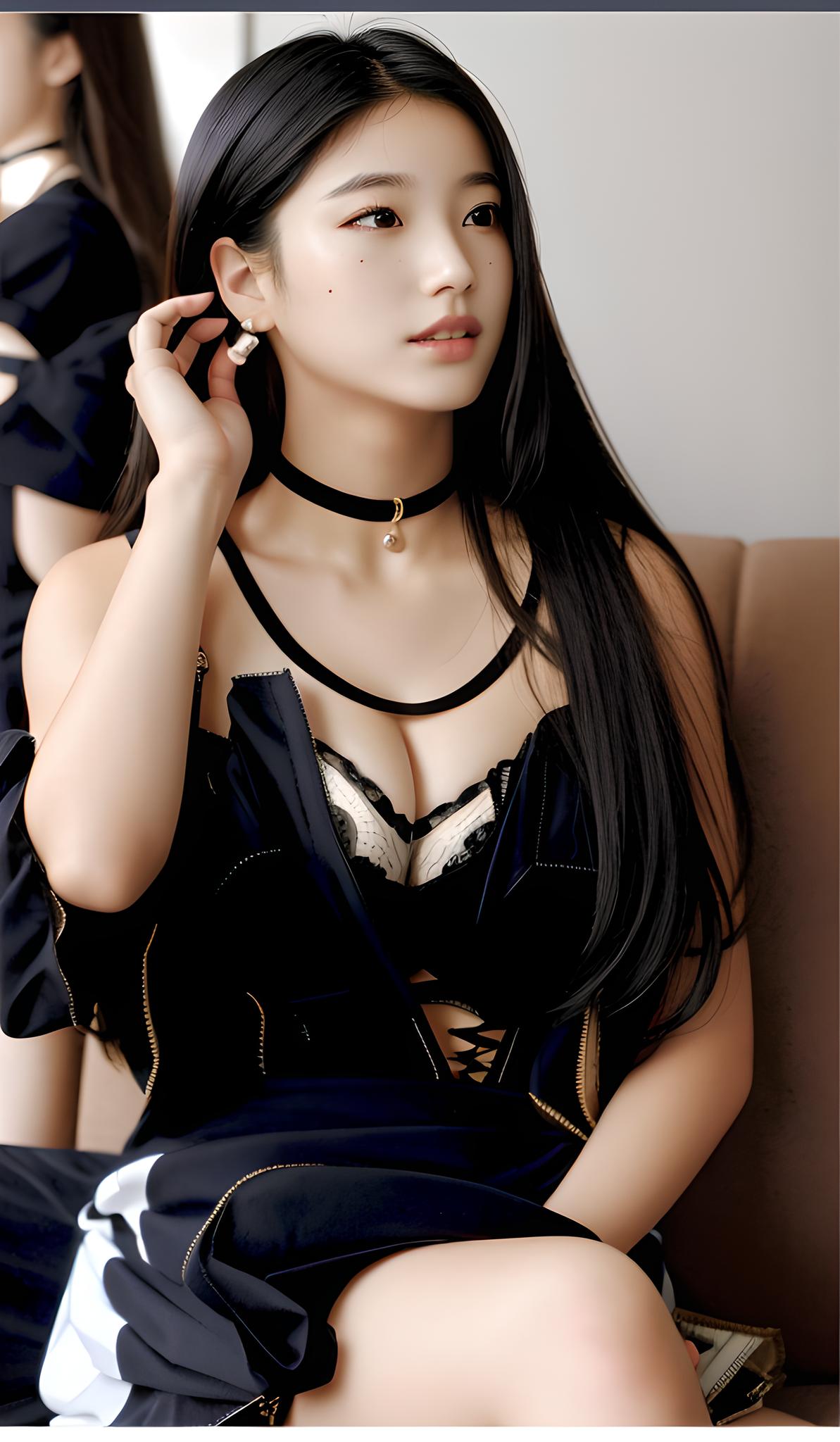 1girl,asian,black_choker,black_eyes,black_hair,blurry,blurry_background,blurry_foreground,bra_strap,brown_eyes,choker,depth_of_field,jewelry,lips,long_hair,mole,mole_under_eye,motion_blur,nose,photo_(medium),realistic,shirt,sitting,solo,spread_legs,striped