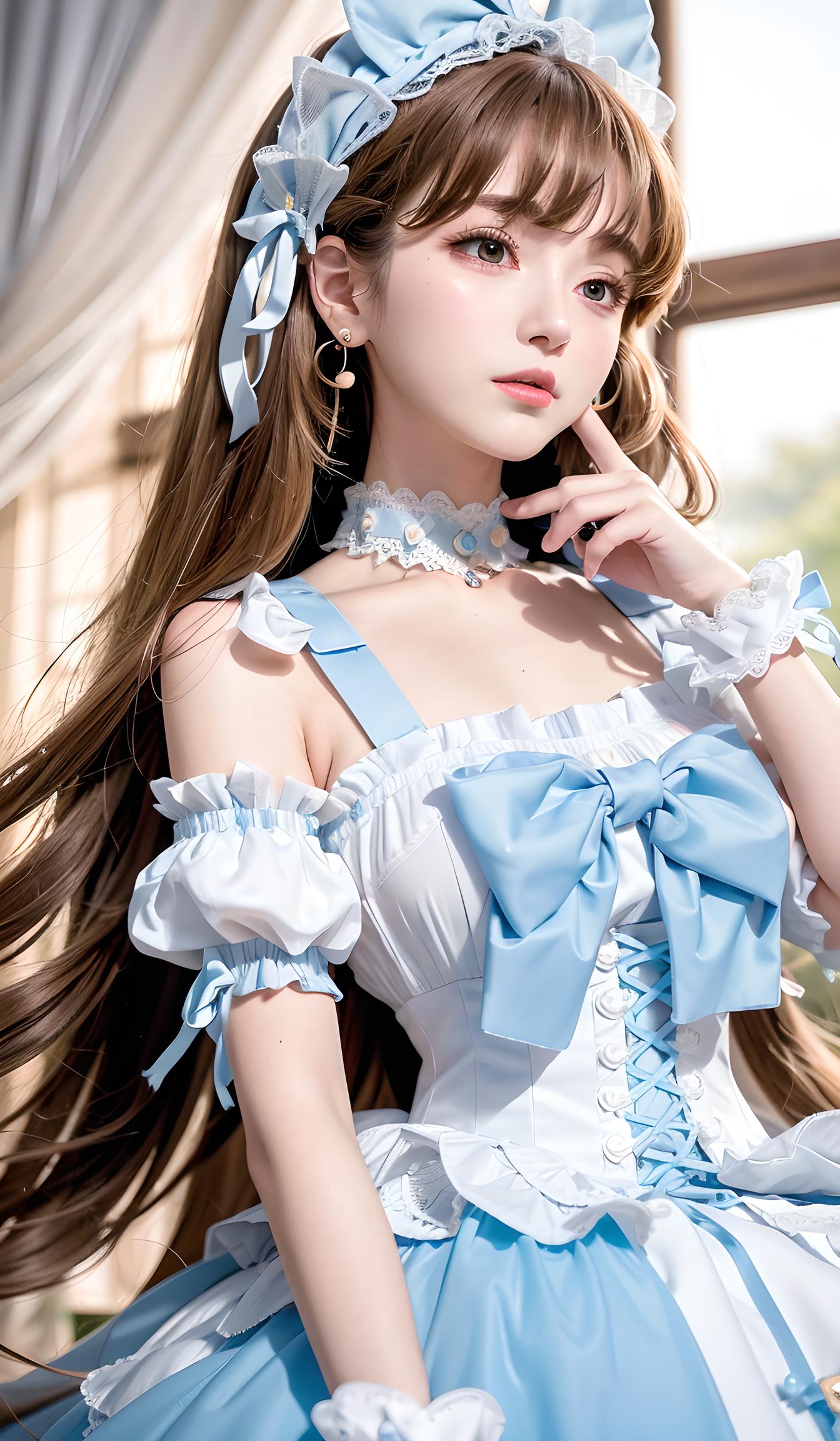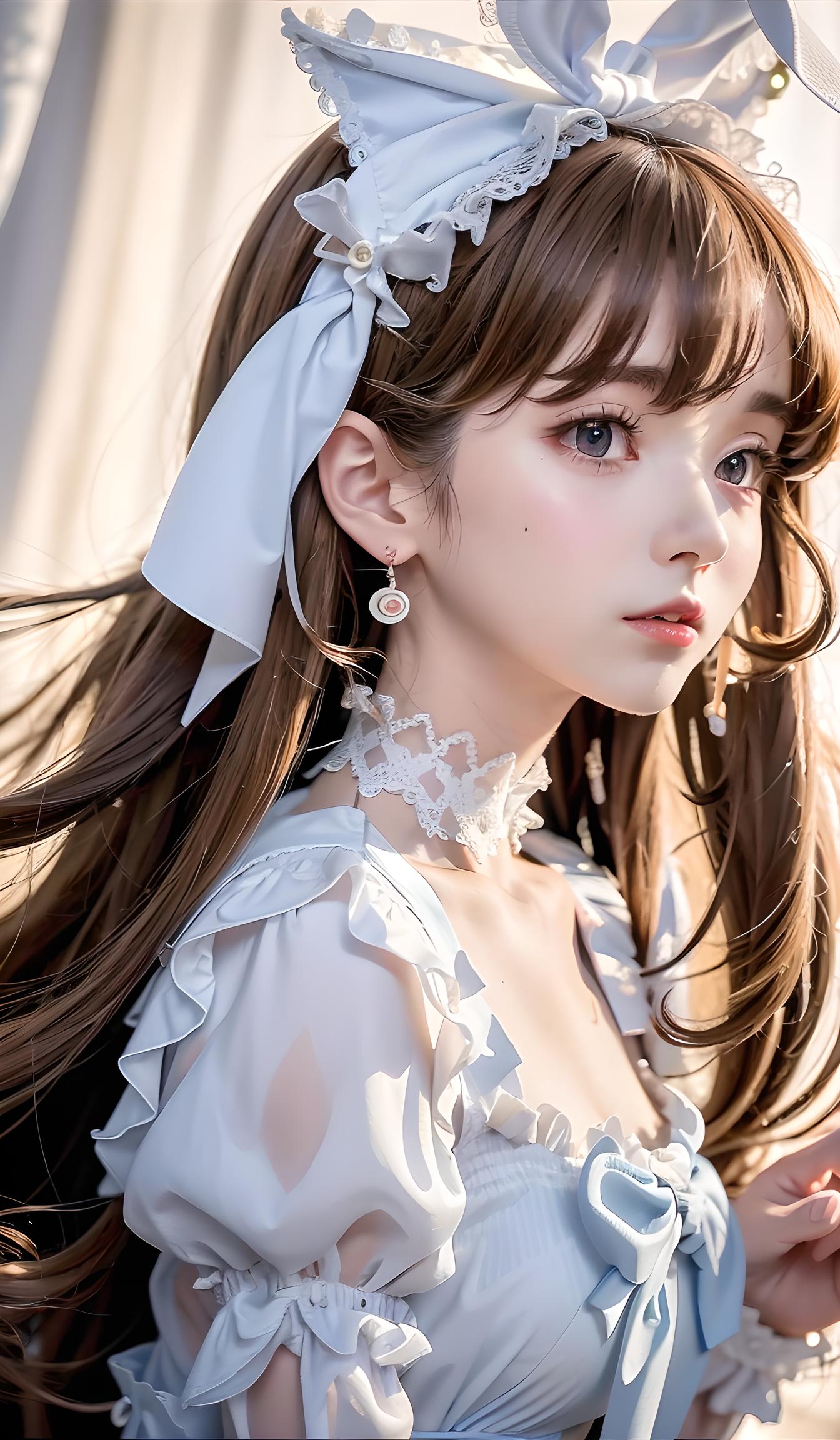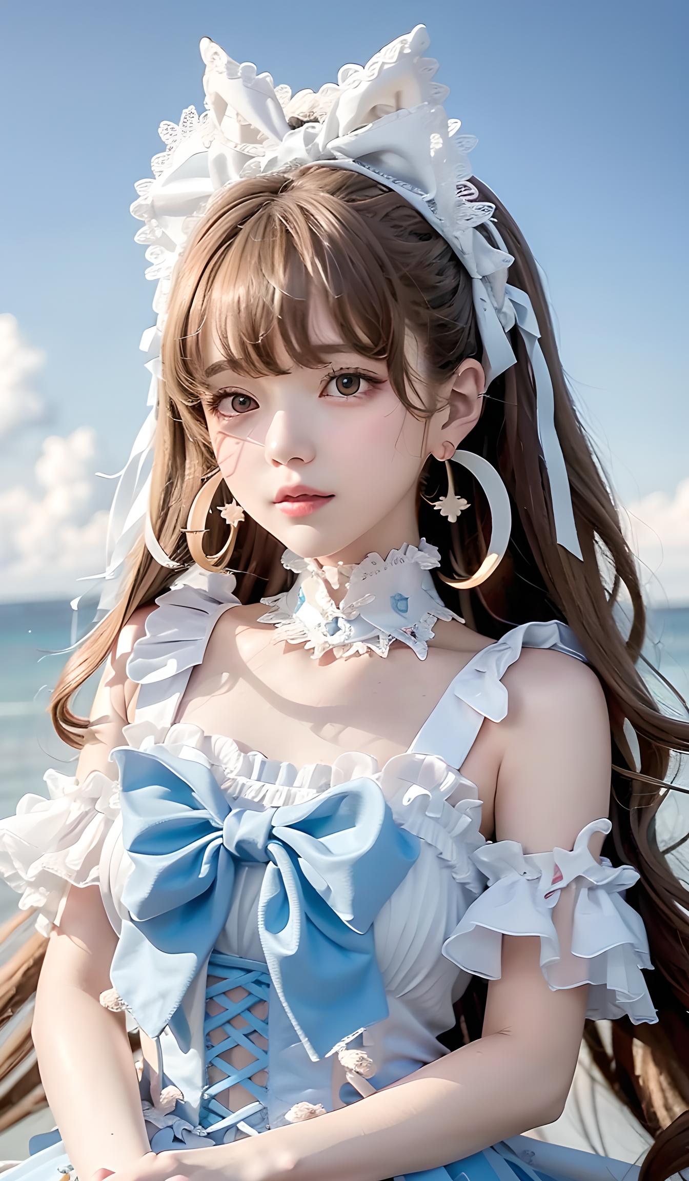 大师作品,最好画质,8k分辨率,全景,肖像,修身洛丽塔套装,女士,平均身高,瘦,方脸,棕褐色皮肤,浅棕色头发,浅蓝色眼睛,[[弯曲的鼻子]],丰满的嘴唇,突出的下巴,长发,卷曲头发、侧刘海、圈形耳环、珊瑚色哑光口红,背景是学校