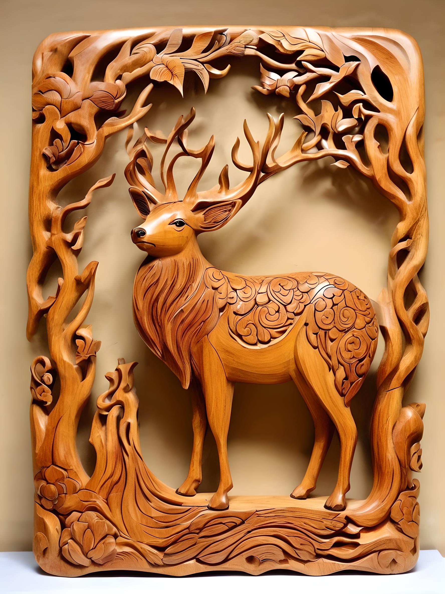 这件木雕艺术品以其精美的工艺和生动的细节,主角是一只站立的鹿,其身体色彩深浅交织,呈现出独特的棕色质感。鹿的头部微微转向左侧,长而分叉的鹿角刻画得极为精细,背景中的树木和树叶被雕刻得栩栩如生,令人仿佛置身于大...查看更多