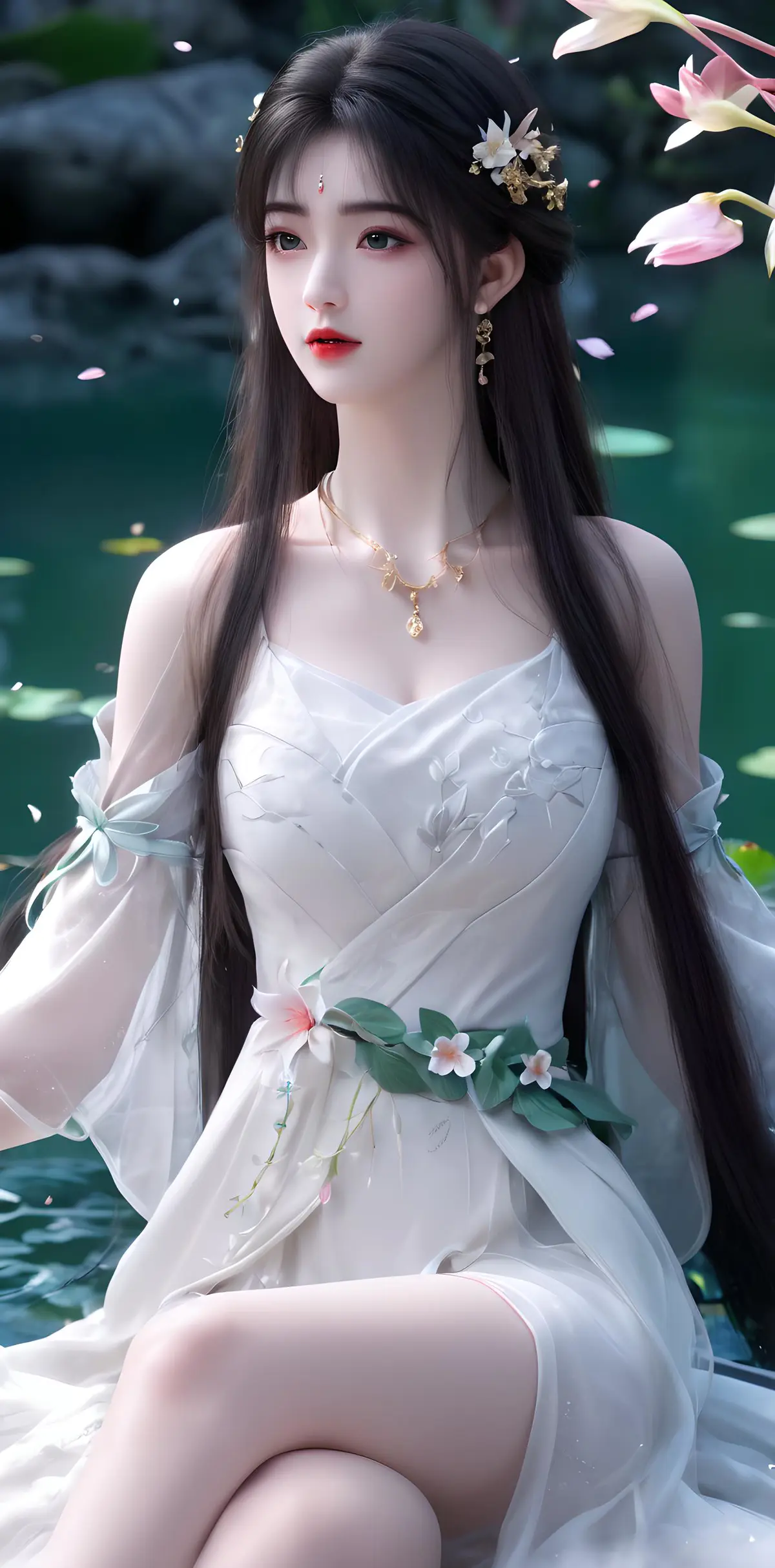 1girl, solo, long hair, black hair, hair ornament, dress, jewelry, sitting, flower, detached sleeves, water, necklace, white dress, bare legs, rock, branch, lily pad