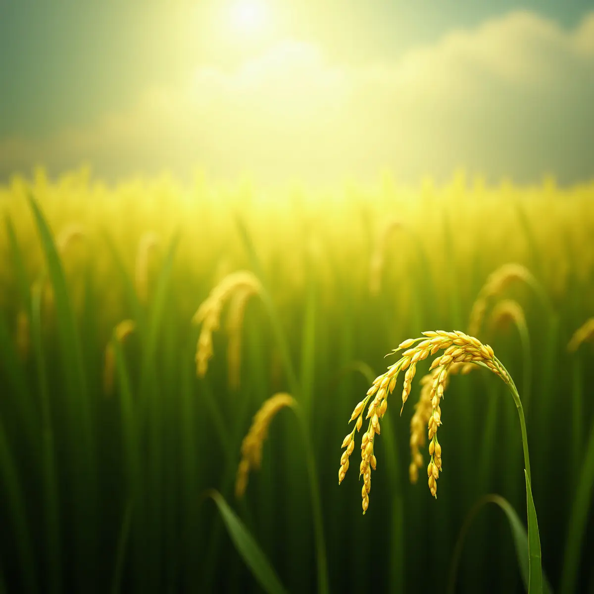 3K分辨率,仙幻风格的水稻田,前景是一株形态饱满的仙稻,稻秆如青玉雕琢,稻叶似水晶凝成泛着莹润绿光,稻穗垂坠着颗颗金黄如碎金的稻粒,粒粒泛着琉璃珠光;背景是无垠的仙水稻田,每一株水稻都同前景仙稻一般,金黄稻粒配水晶叶,田间萦绕着淡金色的灵气薄雾,阳光透过云层洒下形成丁达尔光效,整体画面梦幻唯美,细节拉满,无水印,写实与仙侠结合的质感。
