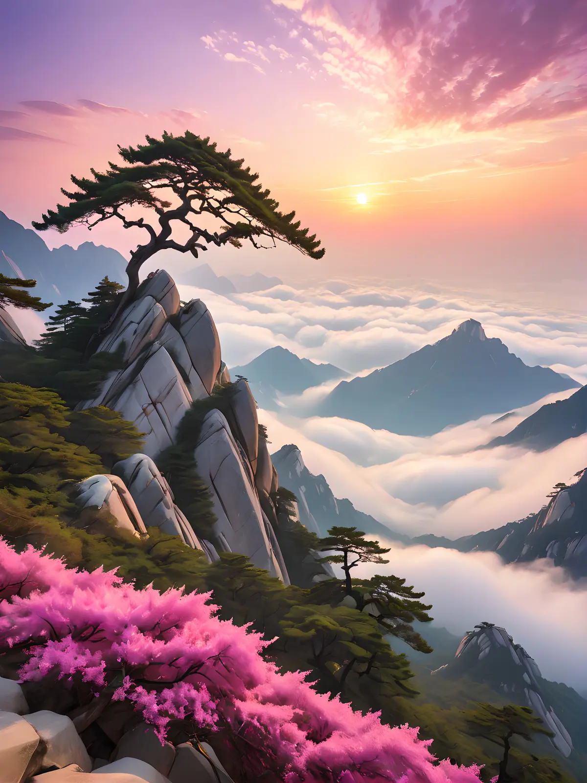 一棵造型奇特,枝干斜倒的枣红色树木傲然挺立在画面下部一角的很高的草绿色的山坡上,俯瞰着远处壮丽的景色,翻腾洁白如棉的云朵沐浴在夕阳的金色光芒中。天空被粉红与紫色的色调渲染,营造出梦幻而宏伟壮观的氛围。华山之巅的日出,下方是云雾缭绕。天空呈粉色,一轮金色的太阳高悬于万物之上。这是一幅写实风格的摄影作品,采用[艺术家姓名]的风格,
