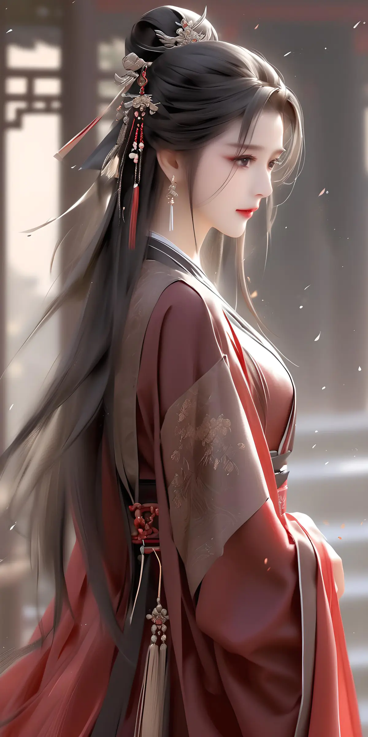 单人女性角色,长发披肩,直视镜头,乌黑发色,佩戴发饰,身着长袖华服,腰间系有绦带,唇瓣微张;画面略带朦胧感,背景虚化,整体为古风中式服饰造型,风格偏向写实。