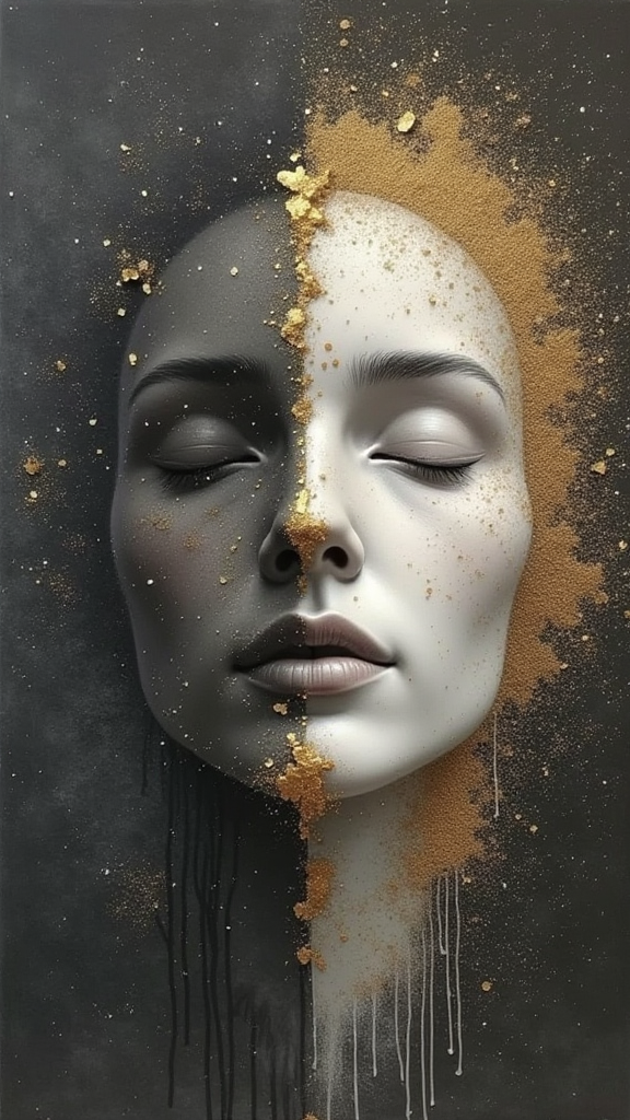 构图与主体:超特写构图聚焦人物五官,光影布局精巧,借留白与线条的虚与线条的虚实相生,凸显五官神韵。