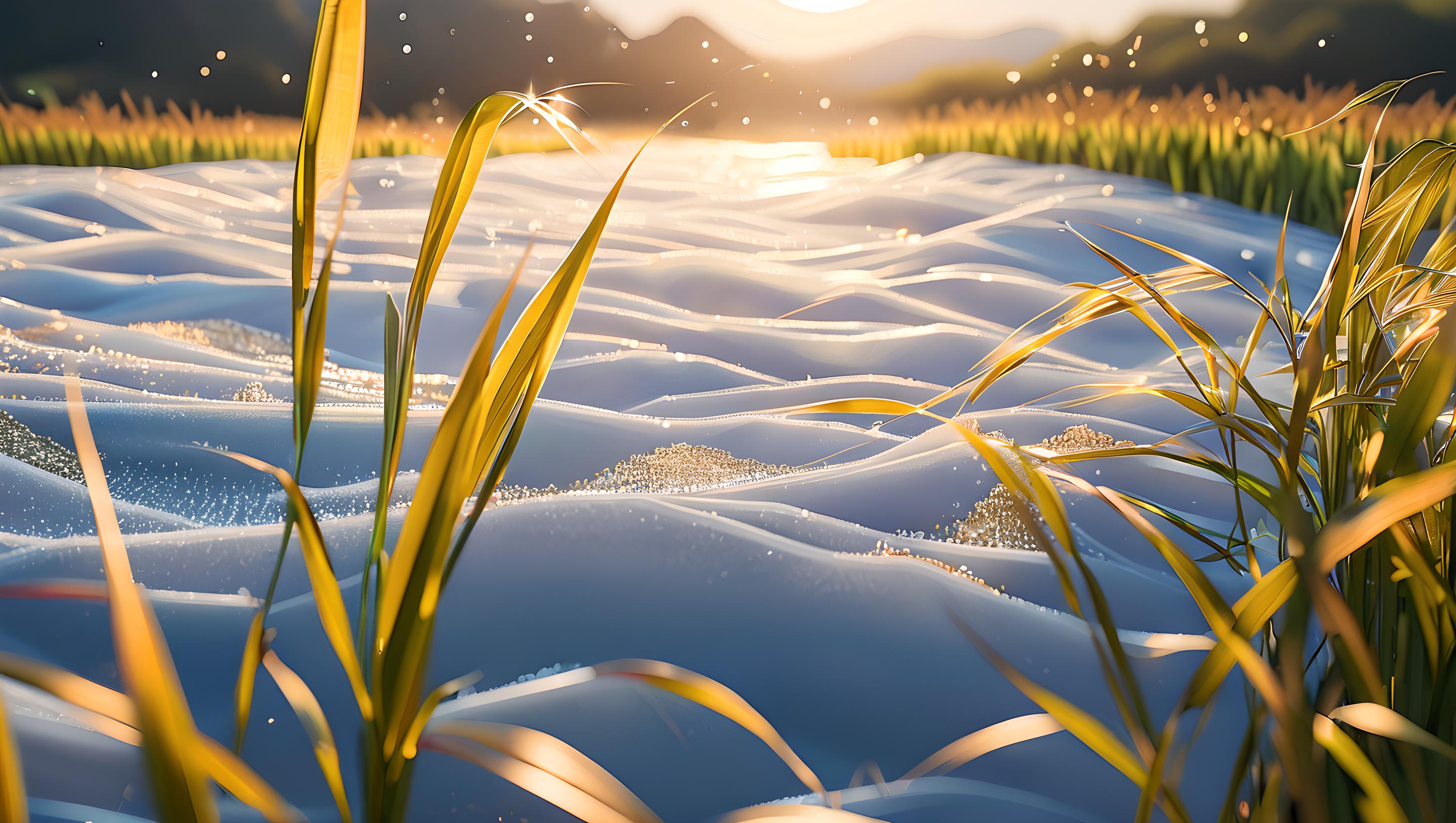 3K分辨率,仙幻风格的水稻田,前景是一株形态饱满的仙稻,稻秆如青玉雕琢,稻叶似水晶凝成泛着莹润绿光,稻穗垂坠着颗颗金黄如碎金的稻粒,粒粒泛着琉璃珠光;背景是无垠的仙水稻田,每一株水稻都同前景仙稻一般,金黄稻粒配水晶叶,田间萦绕着淡金色的灵气薄雾,阳光透过云层洒下形成丁达尔光效,整体画面梦幻唯美,细节拉满,无水印,写实与仙侠结合的质感。