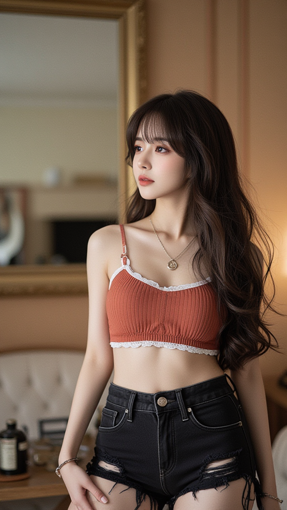 破洞毛边牛仔短裤女孩