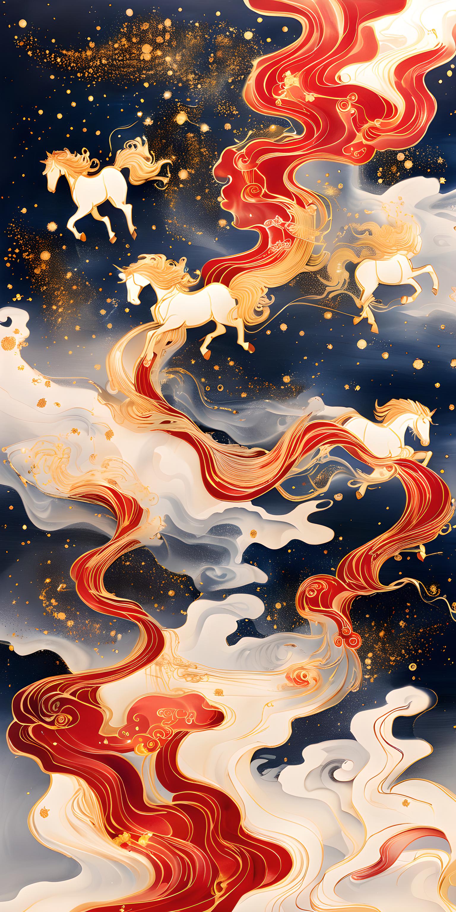 抽象流光背景图:深红底缀淡白星点,数条不一样的金红流动颗粒飘逸光带,华丽神秘。沿着飘带的路径有几匹马在奔跑(风格与整体画面统一)左上角留白