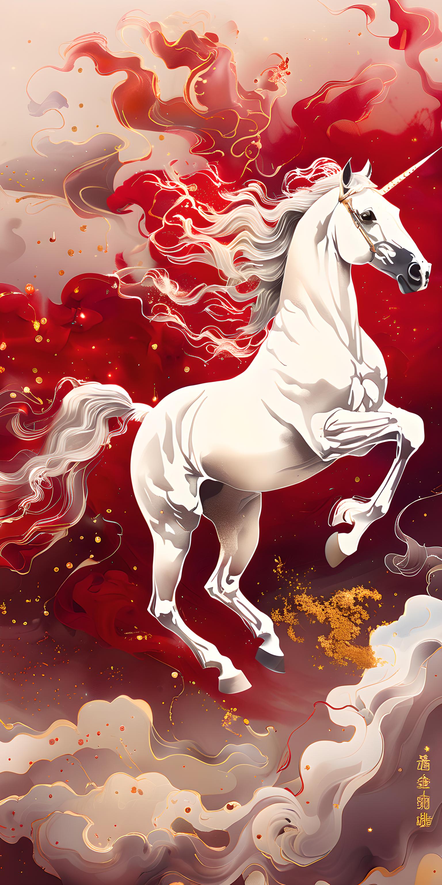 Surrealist art style, a galloping steed composed of golden particles and smoke. Set against a red background, the horse's head retains delicate realistic textures. The mane and limbs are surrounded by flowing deep red smoke/particles, with dynamic lines, gorgeous and festive colors, full of dreamy and auspicious meanings. The overall color palette is mainly red and gold, creating a magnificent and dynamic atmosphere with exquisite details (the flowing layers of smoke, the horse's muscle lines). It is 8K high-definition, combining hyper-realism with abstract textures.