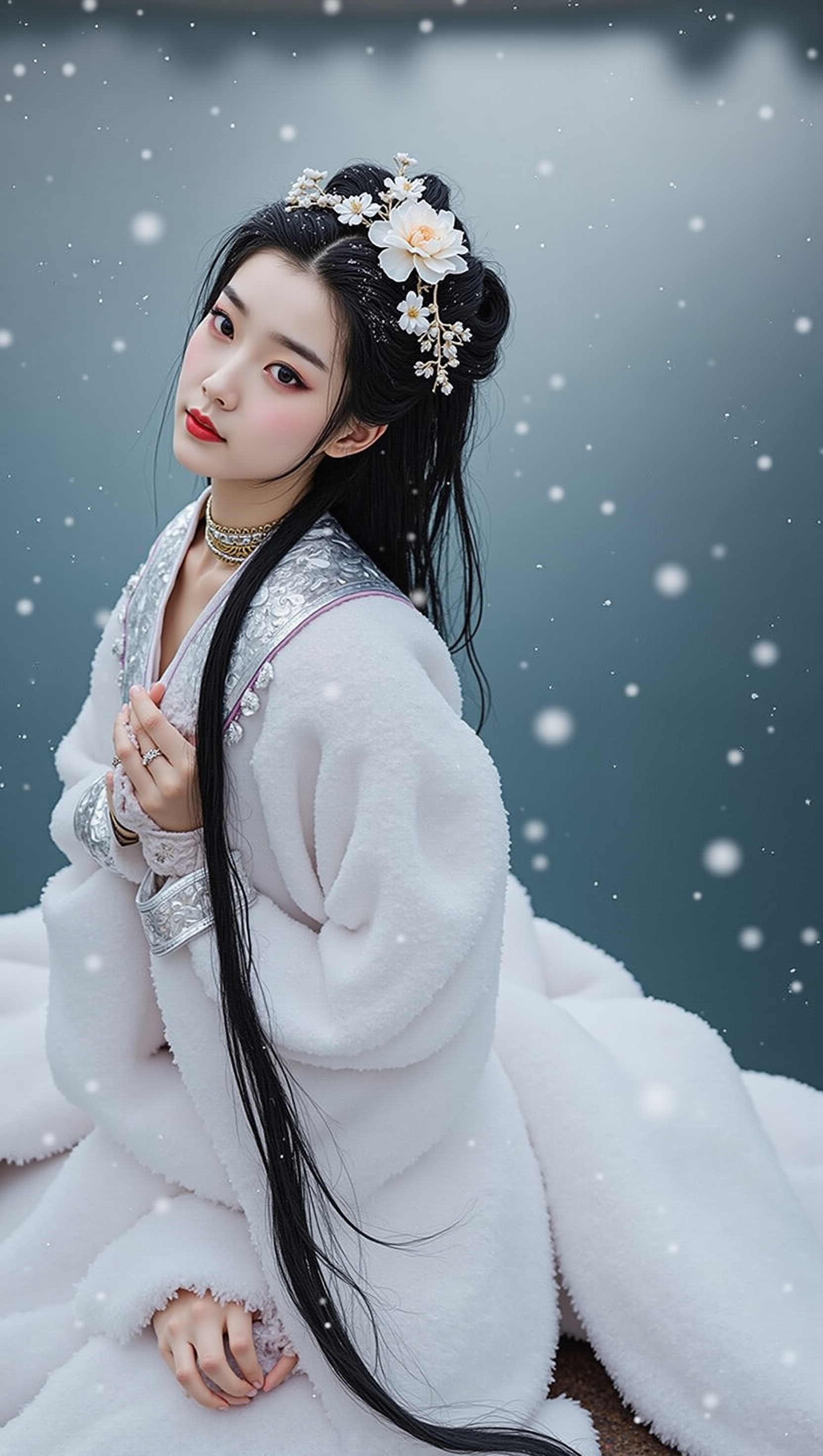 古风,黑发如瀑,挽着好看的发髻,空气刘海,戴着精美的花簪,项链,手镯,耳环,面容精致绝美,仙气逼人,肌肤雪白透亮,身材婀娜多姿,在古木参天、石头潭水碧波荡漾且冬季落雪的园林里,一位身穿战国袍、外披银鼠皮滚边大氅的公主,斜倚圆洞门怀抱玄猫,面容精致,眼神冷艳,长发凌乱地飘散着,白猫安静地伏在她怀里,雪花纷纷扬扬,从正面角度构图,竖屏画面光影明亮。专业人像摄影,正面全身特写照片,各种角度。以32k画质