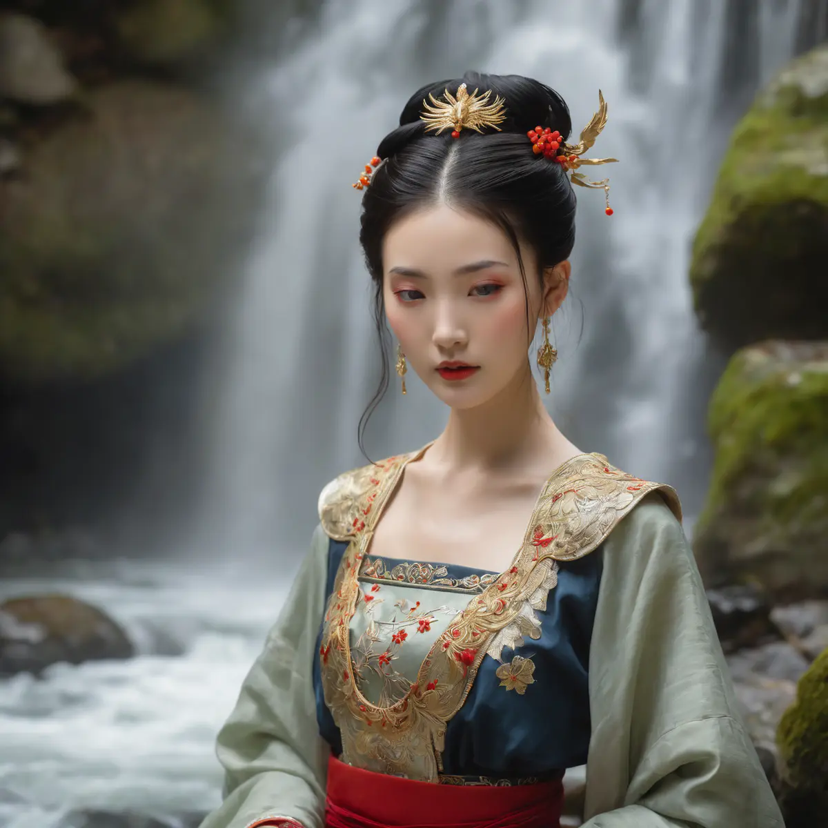 她立在嶙峋的黑石间,一身朱红宫装绣满暗金缠枝纹,领口滚着细碎的珍珠,在幽暗中泛着冷光。高束的发髻上,金质凤钗斜插着,银白的珠串随呼吸轻轻晃荡,衬得那张脸愈发冷艳分明——眉峰如刀裁,眼尾微挑,墨色瞳仁里盛着山涧的寒,唇上一点朱砂,像雪地里燃着的火。