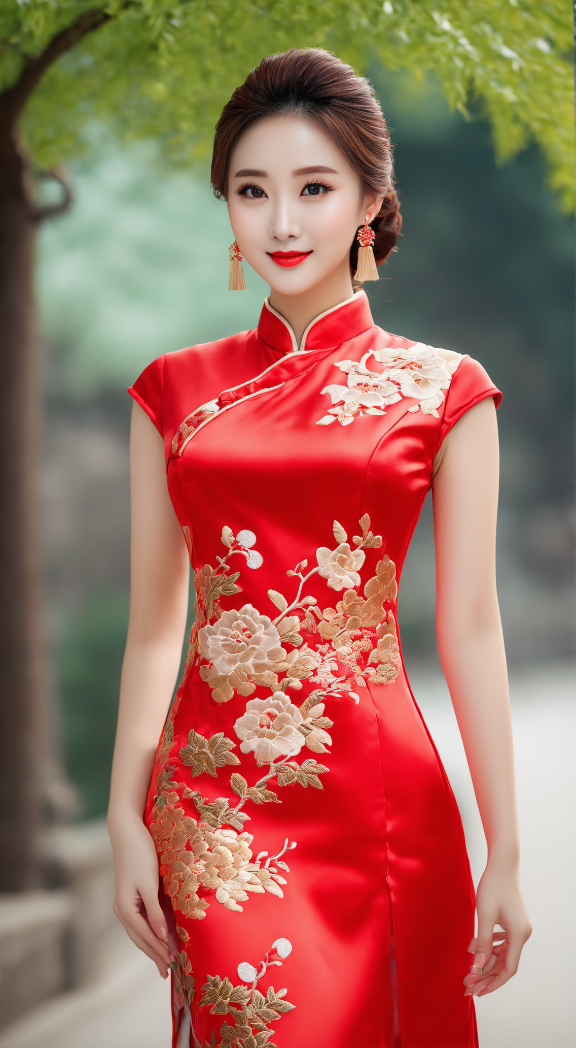 大师作品,8k分辨率,精致的五官,完美的脸,发光皮肤,高细节,更高质量,王艺阳,温柔,(明亮美丽的大眼睛),美瞳,长睫毛,湿润粉唇,挑逗的笑容,精美编棕色高马尾(精美发型),时尚精美耳坠项链,完美身材,户外公园休闲健康步道,站姿,散步,妖娆,妩媚动人,((身穿亮红色醋酸缎面民国旗袍,镶嵌金色饰边,锦缎织物上有精致的青鸟和锦鲤刺绣)),(七分身照),((微笑着全身正面对镜头,人像站在画面中央)) 。