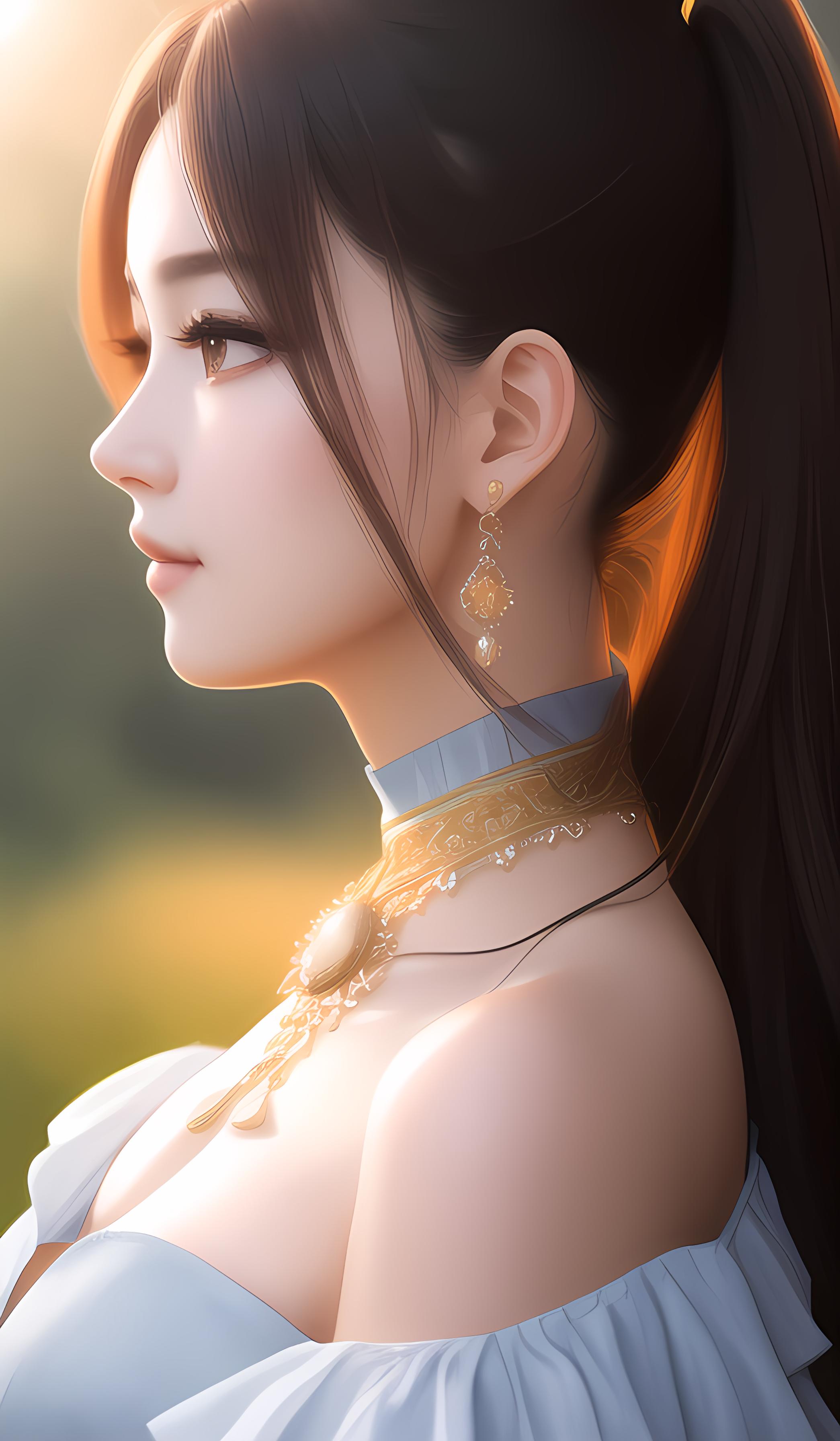 漂亮的美少女,柔美,精致的五官,甜美微笑,精致的眼睛,精致的睫毛,耳钉,项链,精致的锁骨,半身,侧身像