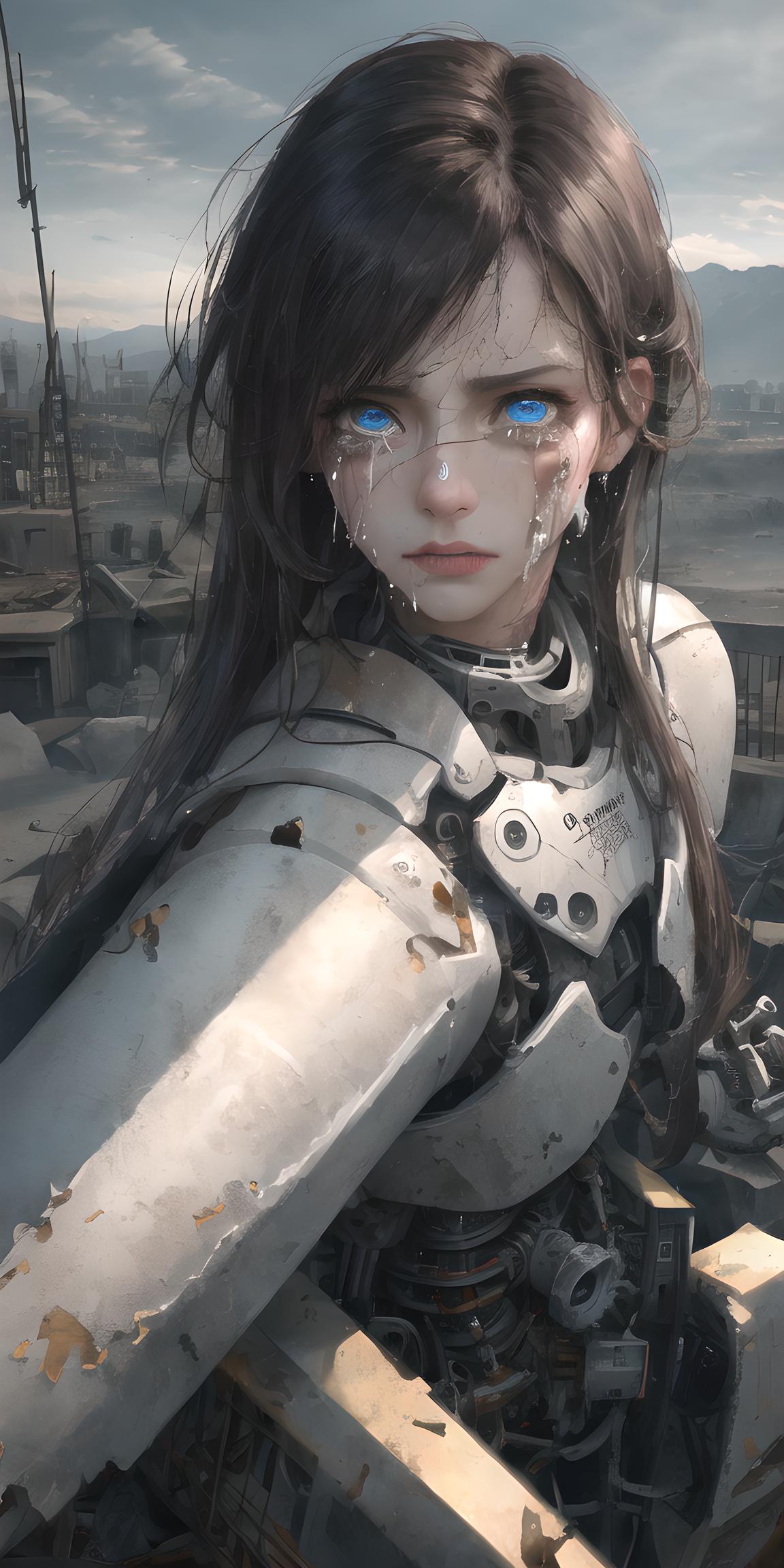 年轻的美少女,白色长发,落泪,阴沉的背景,精致的五官,灵动的蓝眼神,极致细节,世界末日,战争场面,破败的机械城背景,破碎的躯体,损伤的机械手臂,超精细细节,大师作品,真实质感,电影照明真实感,完美作品,8k,高清