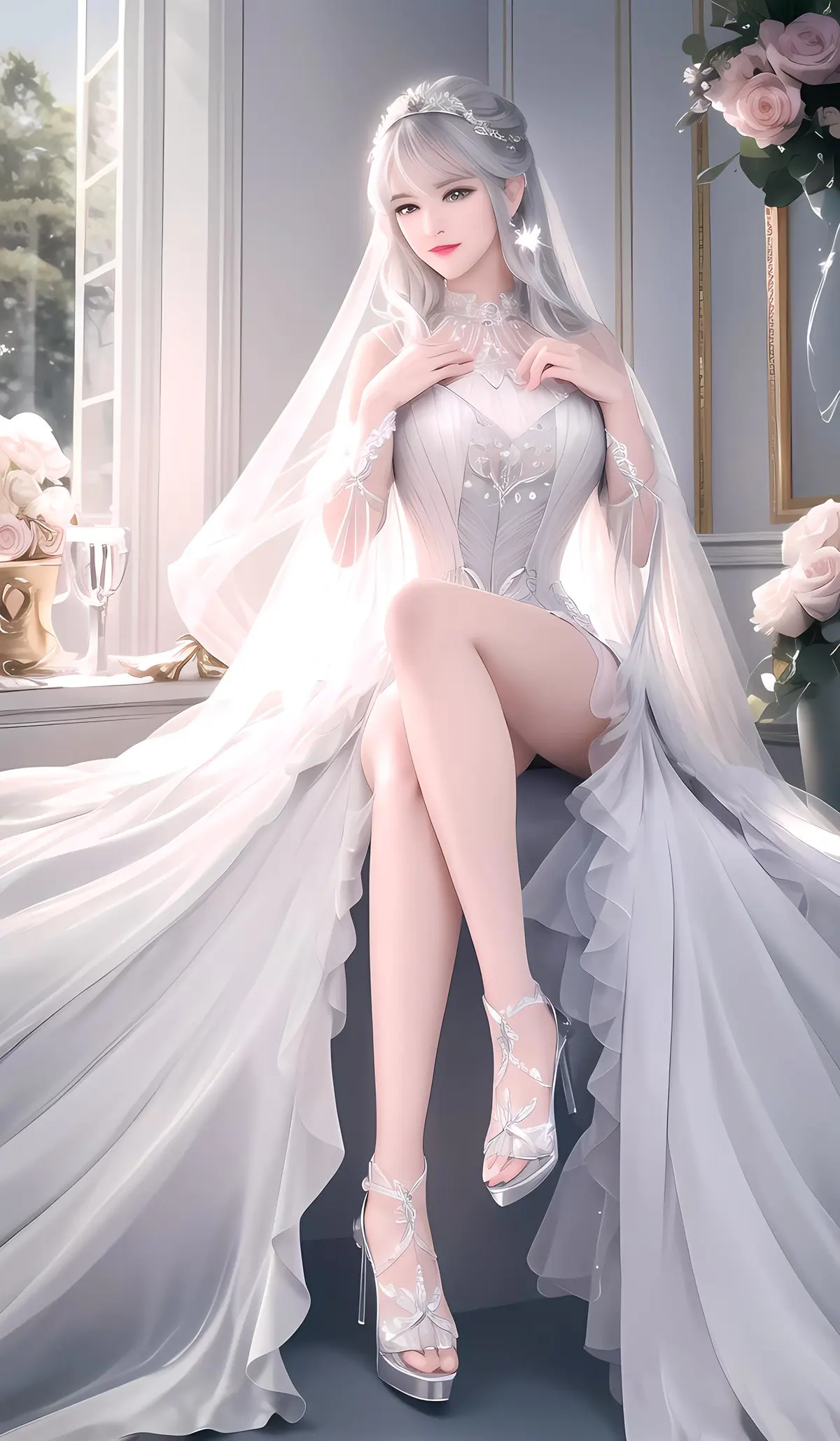 顶级CG,最高画质,杰作,精致细腻的美少女,皮肤白皙,,完美的五官特征,蓝眼珠明亮,红色唇,甜美的笑,漂亮温柔,银白色头发,闪闪发光,穿西式婚纱,露腿,脚穿水晶高跟鞋,最美自然背景