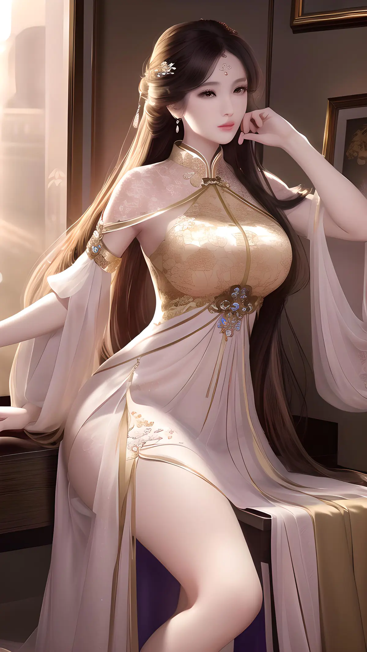 在画面构图上,我会运用黄金比例来安排小姐姐的位置和比例,使得整个画面更加和谐、美观。她可能会被描绘为一个端庄优雅、气质高雅的女子,穿着传统的旗袍。