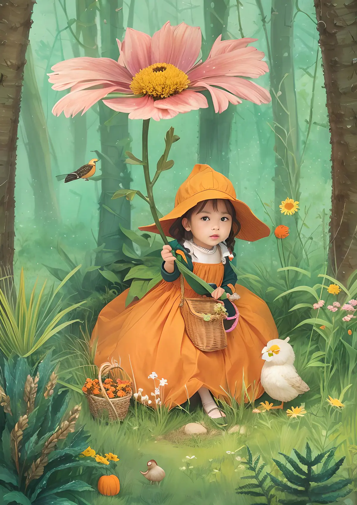 1girl,animal,basket,bear,bird,blush_stickers,braid,brown_hair,bug,bunny,bush,carrot,cattail,chick,chicken,daisy,dandelion,duck,faux_figurine,field,flower,garden,grass,hat,holding_flower,holding_vegetable,jungle,ladybug,leaf,lily_pad,log,minigirl,moss,mushroom,nature,on_grass,on_ground,orange_dress,orange_flower,orange_footwear,orange_headwear,outdoors,palm_tree,plant,pond,potted_plant,pumpkin,squirrel,tomato,tree,tree_stump,tulip,twin_braids,vegetable,watering_can,wheat,white_flower,yellow_flower,rating:safe