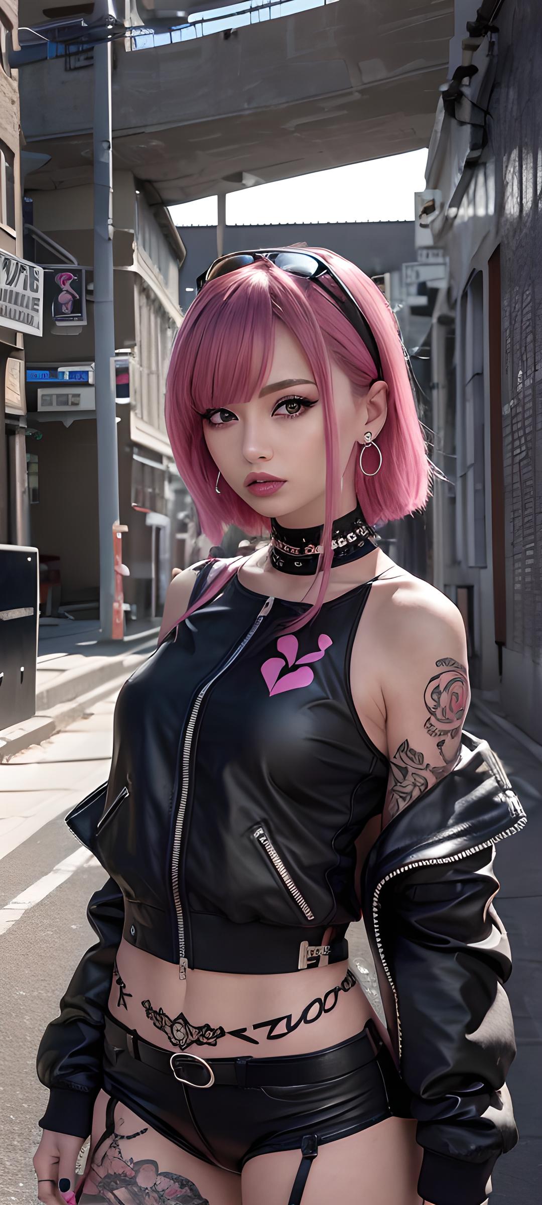 1girl,:p,arm_tattoo,back_tattoo,bangs,barcode,barcode_tattoo,belt,black_jacket,black_panties,body_writing,breast_tattoo,chest_tattoo,choker,earrings,half-closed_eyes,heart_tattoo,highleg,highleg_panties,jacket,jewelry,leg_tattoo,looking_at_viewer,makeup,navel,navel_piercing,neck_tattoo,number_tattoo,off_shoulder,panties,piercing,pink_eyes,pink_hair,pointy_ears,pubic_tattoo,shoulder_tattoo,solo,stomach_tattoo,tally,tattoo,tongue,tongue_out,underwear,rating:safe