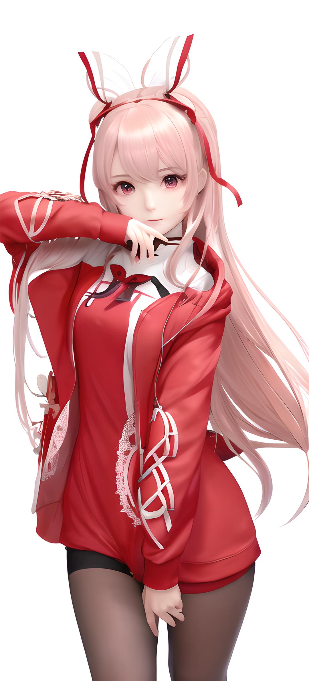 1girl,bangs,black_legwear,blush,hair_ribbon,long_hair,long_sleeves,looking_at_viewer,mouth_hold,no_pants,pantyhose,pink_hair,red_coat,red_eyes,red_hoodie,red_jacket,red_sweater,ribbon,simple_background,sleeves_past_wrists,solo,thighband_pantyhose,white_background,yuudachi_(kancolle),rating:safe