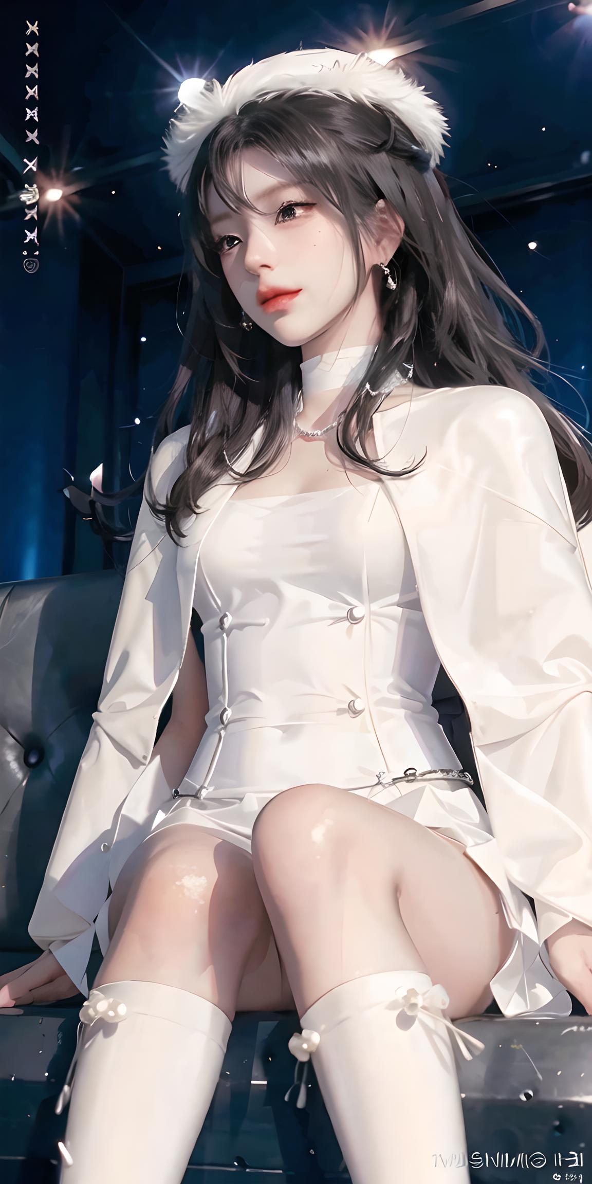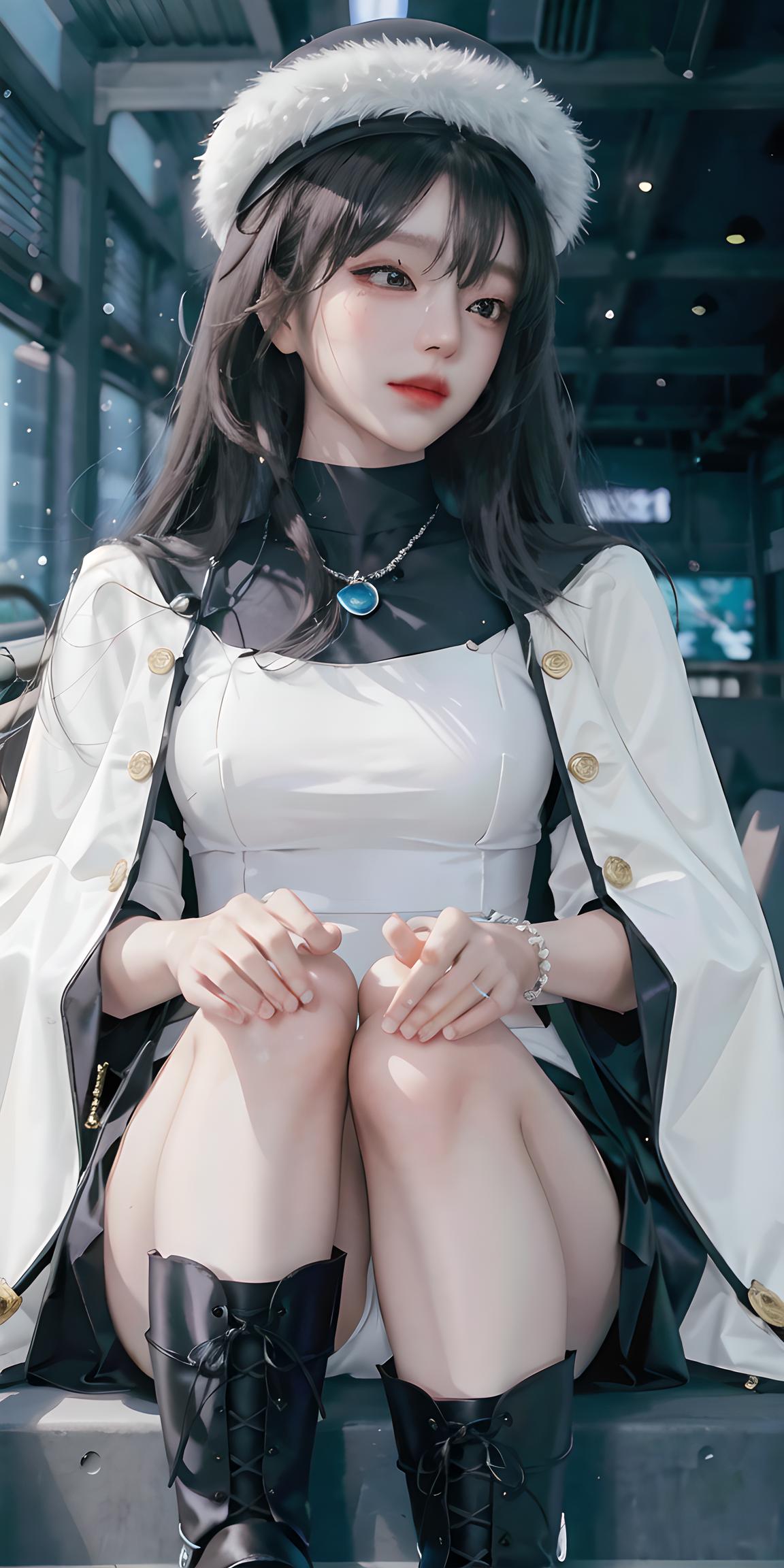 大师作品,最好画质,更高质量,高细节,(8k分辨率),超高分辨率,半身像,精致的五官,完美的脸,女性,单人,水汪汪大眼,长睫毛,闭嘴,思考中,单侧嘴角上扬,长发,白发,眉间刘海,眼睛间的头发,珍珠手链,腕带,珠宝首饰,蓝宝石胸针,项链,蕾丝饰边,高领夹克,军装,皮裙,披肩,军官帽,马丁靴,蕾丝裤袜,向上看,拿着枪,流星雨,机场,电影级光照